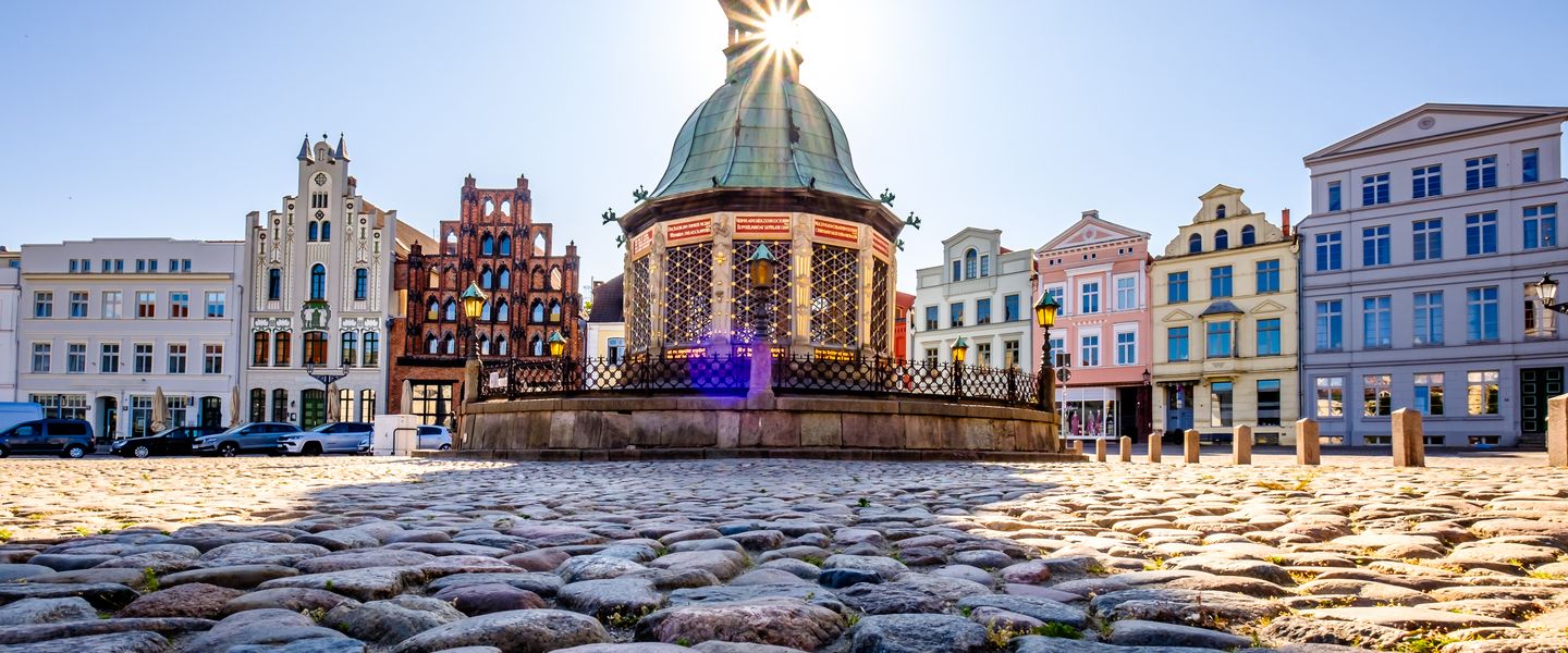 Marktplatz: Der Marktplatz von Wismar ist das Zentrum der Stadt und wird von historischen Gebäuden, darunter das beeindruckende Rathaus und die Wasserkunst, gesäumt.